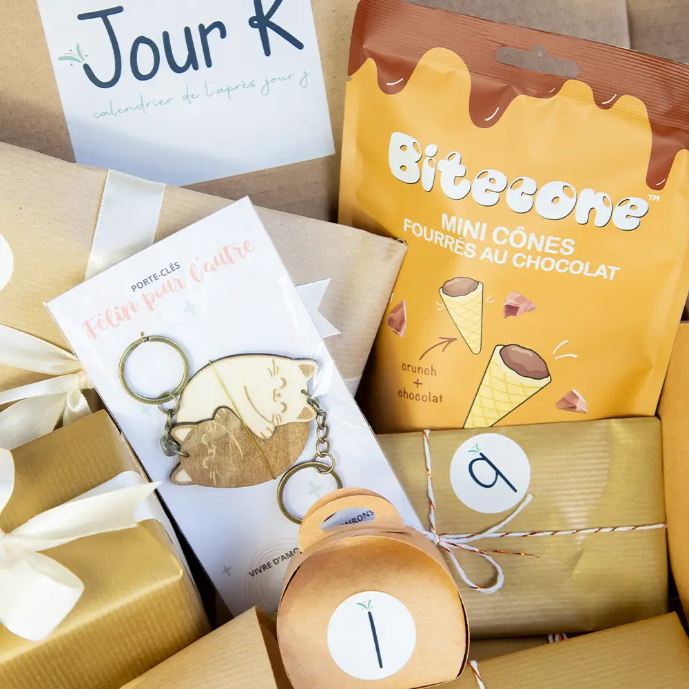 Le calendrier de l’Après Mariage Jour K est né de cette idée : un coffret cadeau imaginé pour les jeunes marié(e)s, contenant 10 surprises à ouvrir en duo après le mariage, une par jour. Une idée cadeau originale pour continuer à savourer ce moment et redescendre en douceur.